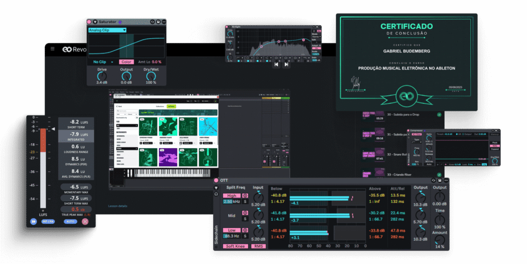 Apresentação da Interface, Preparando o Ableton, Kicks, Claps, Hi hat, Grooves, Bass, Leads, Ambientação, Estrutura do Drop, Estrutura do Break, Subida para o Drop, Drop Final, Intro e Outro, Organização, Sidechain, Equalizar, Masterização, Exportando